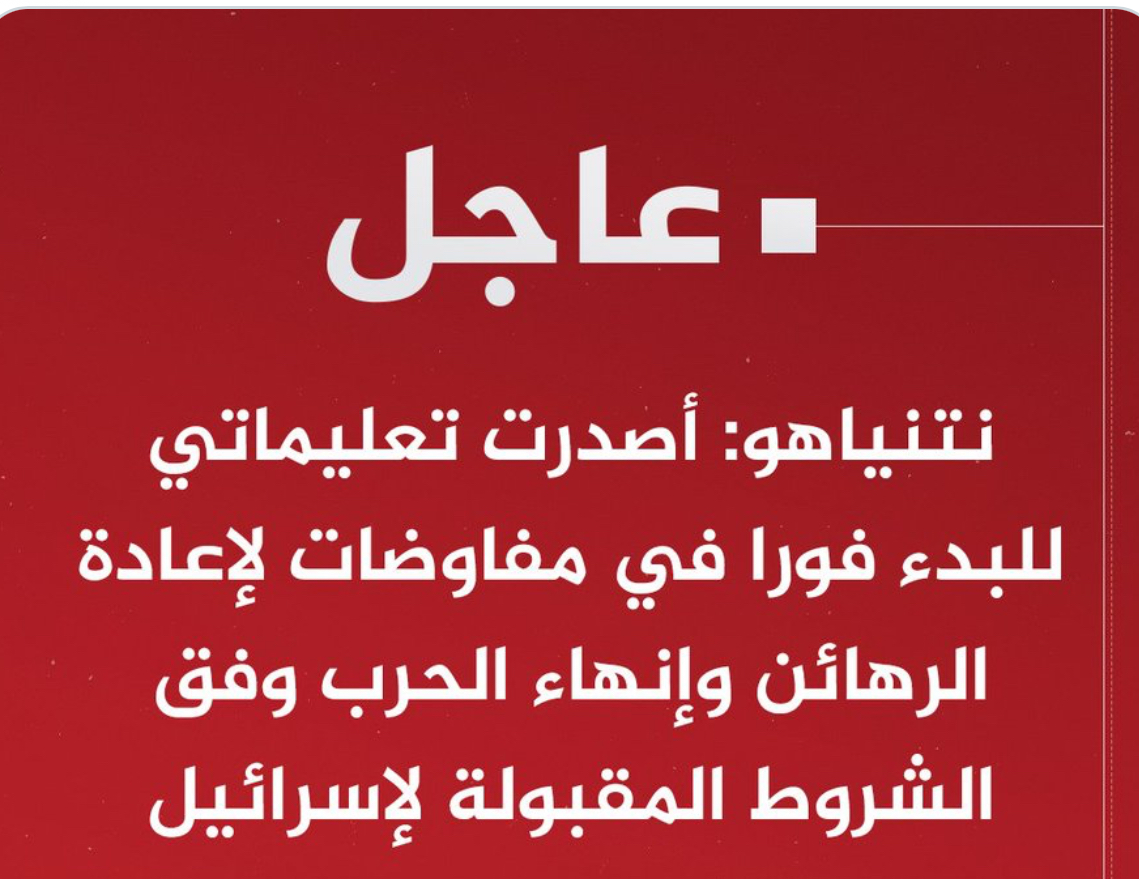 #عاجل | نتنياهو: أصدرت تعليماتي للبدء فورا في مفاوضات لإعادة الرهائن وإنهاء الحرب وفق الشروط المقبولة لإسرائيل